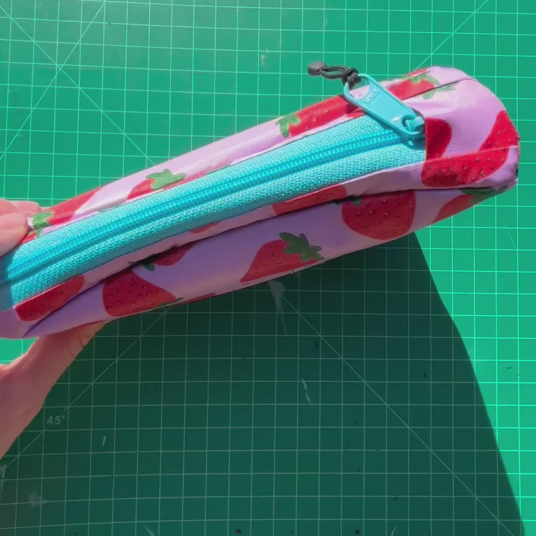 Top tube bag - Strawberry print w/ blue zipper & pink webbing